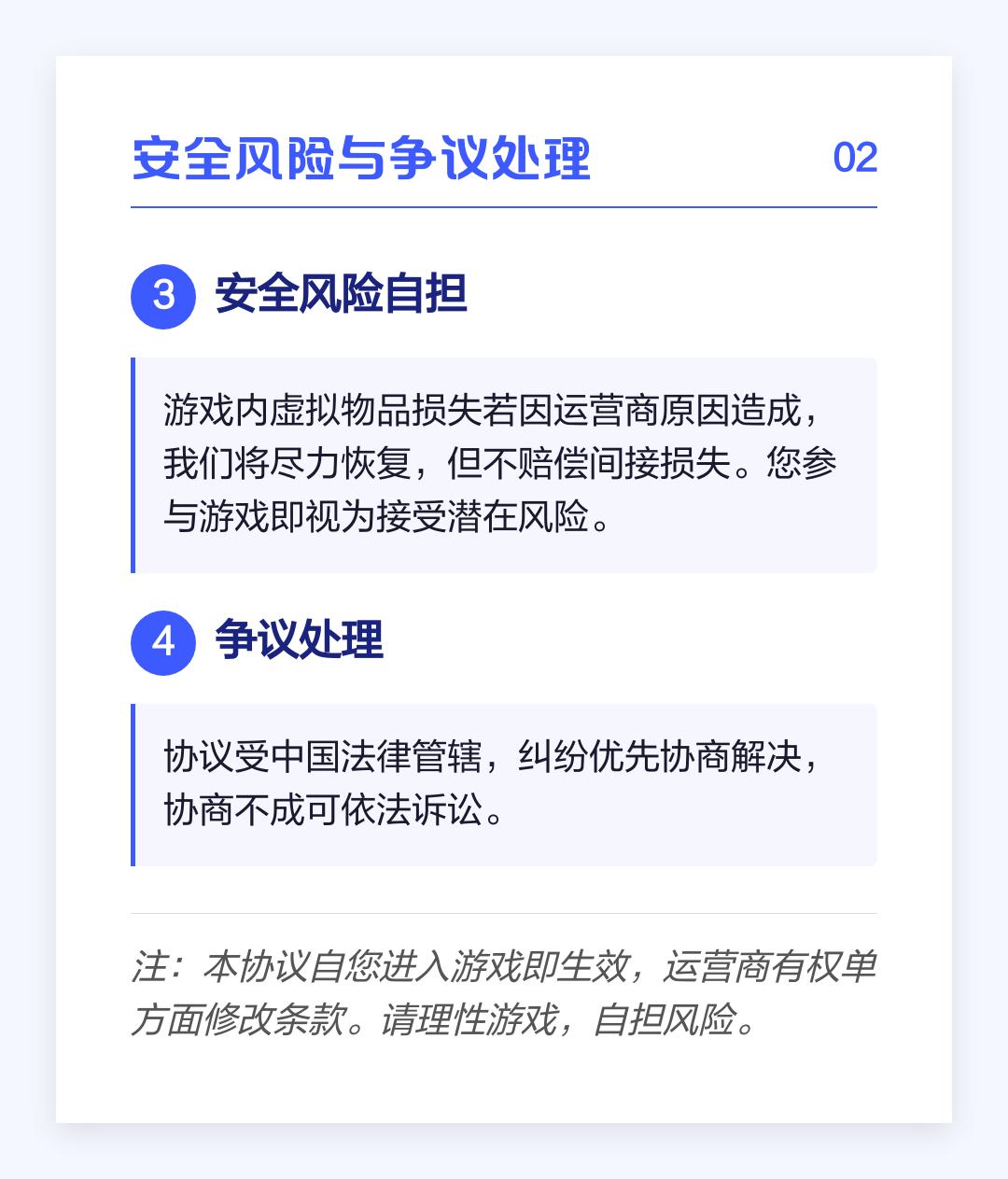 3.安全风险自担:游戏内虚拟物品损失若因运营商原因造成,我们将尽力恢复,但不赔偿间接损失。您参与游戏即视为接受潜在风险。